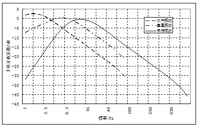 在评价通过手或手指传递到手臂系统的机械振动时,手传计权可反映人体手臂系统对不同频率振动的感觉度,适合人手紧握或伸掌按压处于振动状态的机械结构。ISO5349-1:2001中对此有详细描述和定义,手传计权曲线如图1所示。