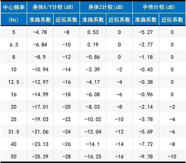 从中可以看出在某些频带中的计权系数可能会相差3dB以上。此外在手传计权系数中,最新的ISO标准中考虑带限滤波器,因而在6.3Hz以下的频带是衰减的,这点与以前的标准有较大区别。