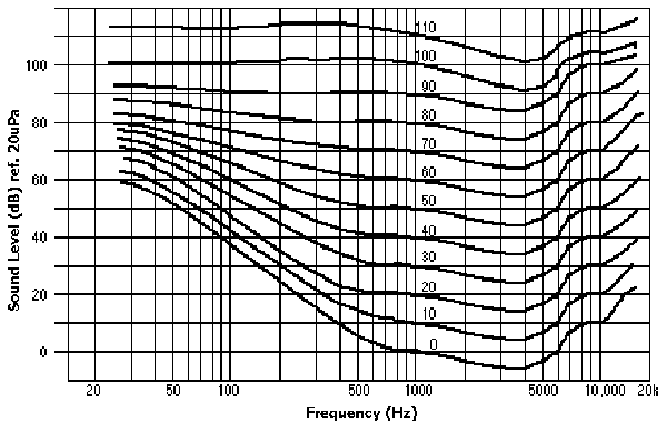 由于人耳的生理构造等特点,人对声音的主观感觉与客观测量的声压之间有非常复杂的关系。可使用响度指标来描述人对声音强弱的主观感受,而等响度曲线如图5所示,可见响度不仅与频率有关,而且与声压大小有关。实际应用中常常使用简化的计权声压级,仅仅对频率进行计权计算,来近似人耳的真实感受。