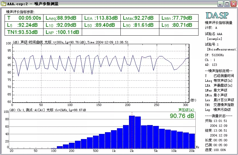 图6为一段时间内测量某高噪声厂房环境中的噪声变化曲线,以及上述各种参量指标。