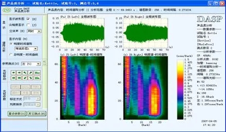 响度是最基本的声品质参数,是听觉判断声音强弱的属性,根据它可以把声音排成由轻到响的次序,它主要依赖于引起听觉的声压,同时也与声音的频率和波形有关,响度的符号为N,单位为宋 (sone)。响度级定义为,根据听力正常者判断为等响的1000Hz纯音的声压级,符号为Ln,单位为方 (phon),响度级与响度之间可以直接换算。由Stevens和Zwicker提出的响度计算模型已经成为ISO532国际标准,但是目前其他的声品质参数尚未被标准化。图7为水壶烧开水全过程的声音响度谱阵分析。