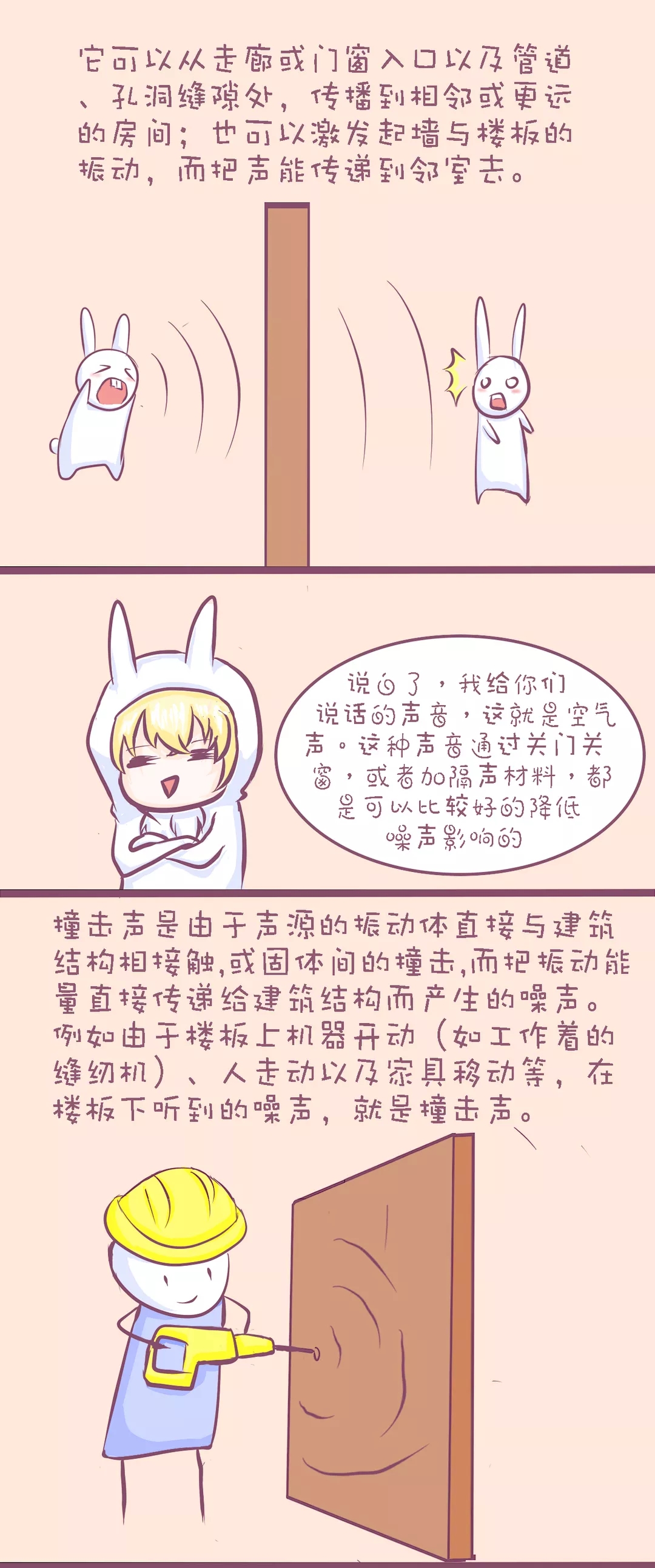 但是撞击声(固体声)就不同了。撞击声通过楼板,墙壁等固体传播噪声,它们引起固体本身的震动进行传播。这种时候,因为介质本身是楼板和墙壁的缘故,关门也无法减弱这些固体的震动,因此这种声音是无法通过关门关窗的手段解决的,所以撞击声往往是建筑防噪中比较难解决的一种噪声。